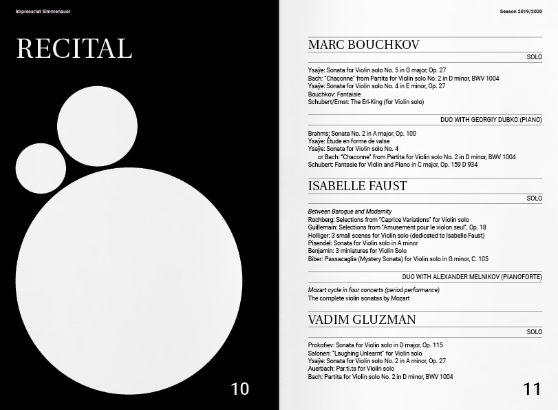 Creative Direction, Editorial DesignImpresariat Simmenauer is an agency for classical musicians with a rich heritage but also a progressive strategy, representing artists like Brandt Brauer Frick. Studio von Monkiewitsch were commissioned to design a new logo and a corporate identity for the agency. Evolving into a family business with the recent entry of Sonia Simmenauer’s son, the new visual identity strives to be an update that reflects the forward-looking and thinking of the agency. We took the old clef logo as the origin for the new logo and reduced it to just the dots - like a familiar tune with a new beat. The minimal language of the logo allows for flexible use, as our designs of their seasonal leaflet, letterhead and business cards show.